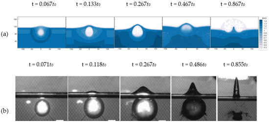 In order to study the dynamics of vapor bubbles, many researchers were involved in experimental research and numerical simulations. In experiments, the usual way to create vapor bubbles is to use pulsed lasers or electric sparks to shoot them instantaneously, and to observe the interaction of the bubbles with the solid surface using high-speed cameras [7,8]. Gonzalez et al. [9] studied the dynamic process of laser-induced bubbles in liquid gaps at different heights. Sun et al. [10,11] concluded that the thermal effect plays an important role in the growth and collapse of vapor bubbles in microchannels. Kangude et al. [12] studied the cavitation mechanism of vapor bubbles on hydrophobic surfaces using the thermal imaging method. The experimental results of Tang showed that the hydrophobic coating has a significant influence on the growth process of laser-induced bubbles [13]. According to the three-dimensional view of the experiment, Hement et al. [14] found that the near-wall bubble collapses very rapidly, and that the tangential flow would lead to the formation of the ring cavity. Considering the influence of gravity and viscosity, Sangeeth et al. [15] studied the jet velocity resulting from bubble collapse at a liquid surface; the dependence of the dimensionless jet velocity, expressed in terms of the Weber number, on the Bond number, is determined by the dimensionless cavity depth. The Weber number is used to measure the relationship between the surface tension and the inertia force, and the Bond number is used to measure the relationship between the gravity and the surface tension. By using a spark-generated device and a high-speed camera, Zhang et al. [16] conducted an experiment on the dynamic process of vapor bubbles under water; six classical water burial phenomena were induced, and their forming mechanism was analyzed. Ma et al. [17] investigated the growth of vapor bubbles under different levels of gravity by conducting an experiment and found that gravity has a significant influence on the growth of a single vapor bubble.