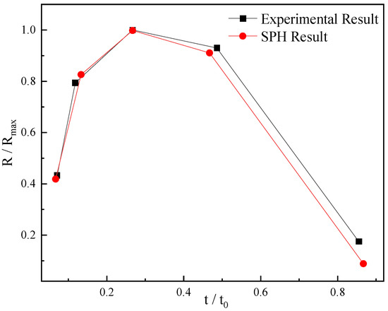 Then, we used the dimensionless distance between the burst point and the free liquid surface with the ratio to the bubble radius in Zhang’s experiment as γf = 0.78 to arrange the heating position in our numerical simulation. We provide the data of two non-dimensional distances instead of one; ε = H/Rmax represents the dimensionless parameter of the liquid layer thickness, and λ = L/Rmax represents the dimensionless parameter of the bubble heating distance to the bottom of wall. Thus, the relative heating distance to the free surface could be obtained as γ = ε-λ, which has the same meaning as in Zhang’s experiment of γf. Here, we used the height of the liquid layer H = 160dx and the heating distance L = 120dx, where dx represents the initial distance between the SPH particles. After the simulation, we calculated ε = H/Rmax = 2.22, λ = L/Rmax = 1.43; therefore, γ = ε − λ = 0.79, which is approximately equal to the γf value of 0.78 in Zhang’s experiment.