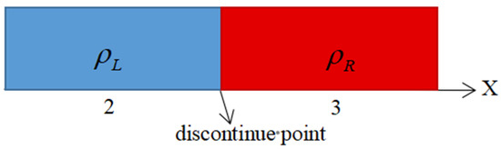 Figure 5 shows the typical settings for a shock wave problem, and the discontinuity point is at x = 2.5. The initial state of the fluid on either side of the discontinuity point is and . The specific heat capacity at constant volume is . The equation of state is as follows: