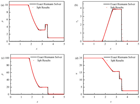 The results for when the time t = 0.4 are shown in Figure 6. The red scatter is the result of the SPH, and the black line is the result of the exact Riemann solver. The SPH results agree well with the analytical solutions. This shows that our method is reliable in simulating the flow caused by the density and pressure difference.