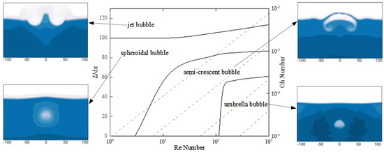 According to Figure 7, the liquid-surface vapor bubble takes on the jet shape, which is not greatly affected by the Re number. On the other hand, the near-wall vapor bubble varies in shape depending on the Re number and the Oh number. The shape can be divided into umbrella, semi-crescent, and spheroid. When Re > 1.5 × 102 and Oh < 3 × 10−4, an umbrella shape is observed; when Re < 5 × 100 and Oh > 10−3, a spheroidal shape is present; and when 5 × 100 < Re < 1.5 × 102, 3 × 10−4 < Oh < 10−3, the bubble is categorized as semi-crescent.