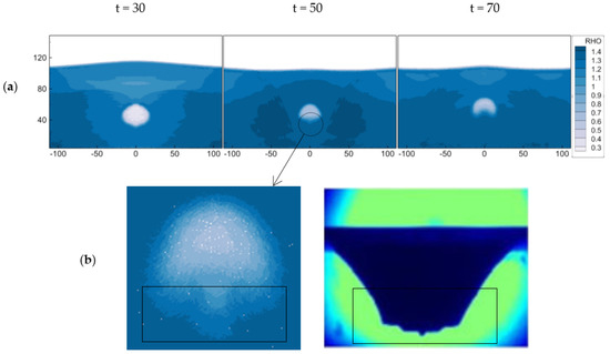 For case C8, Figure 10 and Figure 11 depict the density change and flow field vector diagrams of the umbrella bubble. The Re ≈ 150, and Oh ≈ 10−4. Initially, the bubble experiences extrusion pressure from both the left, right, and lower sides of the liquid, resulting in a longer flow field vector in the lower part of the bubble than in the upper part. As the Oh number reaches the minimum, due to the progressive damping of the capillary waves decreasing at t = 50, the bubble’s edge becomes more irregular, causing it to transform from the ellipse to the umbrella shape. Throughout the process, buoyancy generates an upward force on the bubble, causing it to ascend. This results in the “umbrella handle” beneath the bubble to contract inwards, culminating in the formation of the fan bubble at t = 70.