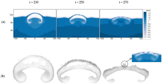 Figure 12 shows the density change and flow field vector diagram of the semi-crescent bubble in case C8. The Re ≈ 80, and Oh ≈ 8 × 10−4. We found that at t = 230, the gas in the bubble moved up to the liquid surface to form a liquid film, the liquid film did not break during the expansion, and a thin “liquid bridge” appeared on the top of the liquid surface. Subsequently, when t = 270, the surface tension of the “liquid bridge” prevented the bubble from breaking, and it started to shrink downwards due to the force of the “liquid bridge”. The flow field vector diagram in Figure 12b shows that due to the high temperature gas in the vapor bubble interacting with the free liquid surface, the “liquid bridge” vaporized, and small vapor bubbles formed quickly. Eventually, the vapor bubble collapsed on the free surface.