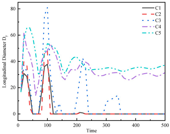 The longitudinal diameter changes of near-wall bubbles (C1~C3) and liquid-surface bubbles (C4~C5).