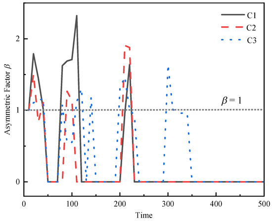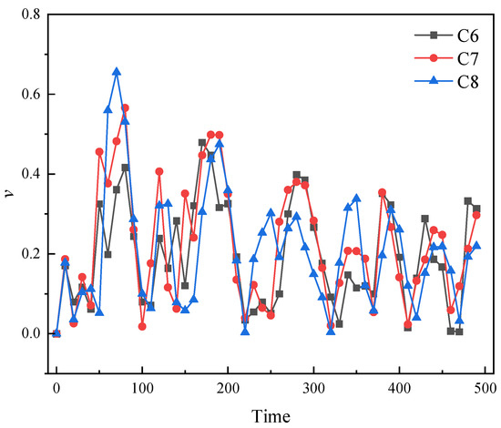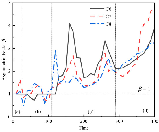 The changes of near-wall bubble symmetry coefficient in cases C6~C8.