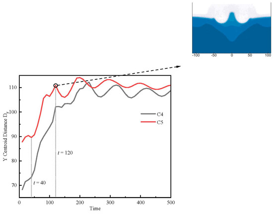 Figure 16 shows a graph of the centroid of the Y-axis for the liquid-surface bubbles in cases C4~C5. The results show that after t = 40, when the vapor bubble moves nearer to the liquid surface, the higher the gradient of the curve will be. That is, the more rapidly the vapor bubble moves upwards, the more pronounced the jet shape generated by the impact with the free liquid surface. The reason is that as the bubble goes up, it becomes smaller and smaller as it moves closer to the surface. So much of its energy can be transformed into the jet’s potential energy and the energy of the bubble’s growth and collapse.