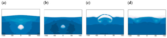 Based on the morphology characteristics of several stages, the graph of the symmetry coefficient is drawn in Figure 20. Figure 21 shows the stage change chart of case C8, and it is used to classify the stage change of these three classical situations. From Figure 20 and Figure 21, it can be seen that during the initial stage (a), the bubble is subject to extrusion pressure from both the left, right, and the lower sides of the liquid, the bubble changes from an oval to an umbrella shape, and it appears that in the stage (b). Then, as the bubble goes up, the differential pressure in the interior and exterior of the gas–liquid interface at the bottom of the bubble becomes larger. Consequently, the lower part of the bubble quickly contracts inwards and presents a semi-crescent shape as shown in stage (c). Simultaneously, when the bubble approaches the free liquid surface, it pushes it up and forms a liquid film. While the fluid film expands without breaking, a thin “fluid bridge” is formed at the top of the bubble. In the final stage (d), because the surface tension of the “liquid bridge” prevents the bubble from breaking, it merges with the liquid surface.