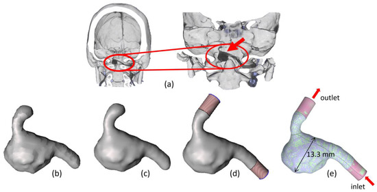 - Cebral, J.R.; Mut, F.; Raschi, M.; Scrivano, E.; Ceratto, R.; Lylyk, P.; Putman, C.M. Aneurysm rupture following treatment with flow diverting stents: Computational hemodynamics analysis of treatment. AJNR Am. J. Neuroradiol. 2011, 32, 27–33. [Google Scholar] [CrossRef] [PubMed]