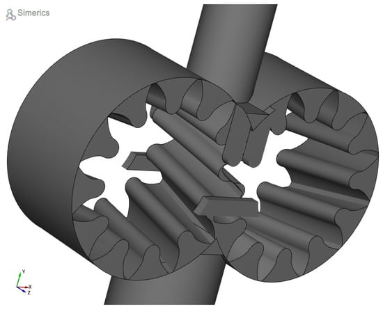 - Heisler, A.S.; Moskwa, J.J.; Fronczak, F.J. Simulated Helical Gear Pump Analysis Using a New CFD Approach. In Proceedings of the ASME 2009 Fluids Engineering Division Summer Meeting (Volume 1: Symposia, Parts A, B and C), Vail, CO, USA, 2–6 August 2009; pp. 445–455. [Google Scholar] [CrossRef]