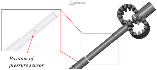 The 3D CFD numerical model also allows for the study of the pressure wave effects, so an analysis of the pressure ripple at the delivery side of the pump has also been conducted. To reproduce the same conditions of the experimental validation campaign, the numerical model has been implemented with a supplementary volume. This new volume has the same geometry as the one used on the test bench, which consists of a rigid duct with a calibrated fixed orifice of 1.72 mm at its end. The final geometry implemented in the numerical model is shown in Figure 7, where there is also represented the position of the monitoring point added into the model located at the same position as the high-frequency pressure transducer (P3 in Figure 2) used during the experimental campaign.