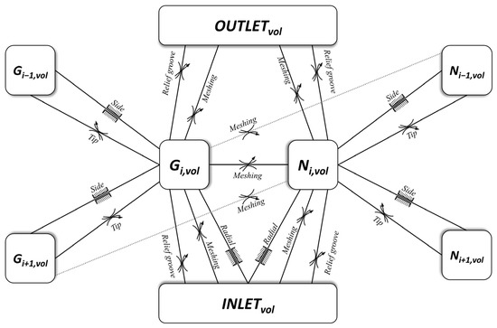 In this work, the lumped parameters approach has been implemented by the authors developing a complete simulation tool to analyze and predict both the fluid dynamics and the mechanical properties of EGPs. This tool is based on the previously described methodology [13] with a better focus on the modeling of the leakages, especially the ones coming into effect over the tip of the gears’ teeth. Figure 8 shows a schematization of all the control volumes and internal connections into which the pump has been divided by the developed tool and used in this analysis. As it can be seen, the pump domain has been divided into four types of control volumes: one for the outlet volume, one for the inlet volume, and the last two types for the volume between a couple of following teeth, one for each gear and in number equal to the gears’ teeth.