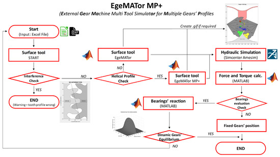 The tool developed by the authors for numerical simulations of external gear machines is called EgeMATor MP+ (External Gear Machine Multi Tool Simulator for Multiple Gears’ Profiles). It permits simulating pumps with both traditional spur gears and helical gears profiles. The tool is comprised of different subroutines developed in diverse environments, interconnected to each other, as apparent from its workflow presented in Figure 9, to study the EGMs in depth.