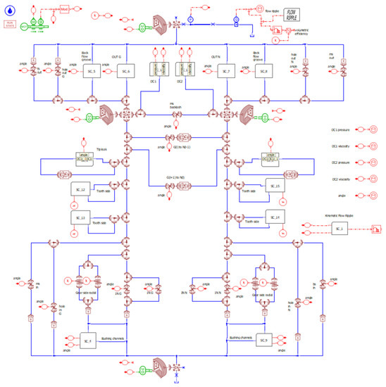 A lumped parameter numerical simulation has also been built up for studying the reference pump. As known, the model subdivides the computational domain into a number of control volumes, each of them assumed to have homogeneous properties, such as pressure, temperature, density, etc. This numerical simulation approach is one of the most utilized thanks to the excellent compromise between the accuracy obtained and the computational power and time required [8,9,10,11,12,13,14,15,16,17,18,19]. The control volumes are modeled as capacitive elements that evaluate the pressure as a function of the net ingoing flow rate. The connections between these control volumes are modeled by resistive elements computing the flow rate as a function of the pressure drop through them. These resistive elements could be of different types: for connections between the rotating variable chambers and their connections with the inlet and outlet volumes, the resistive elements are modeled as variable restrictors, with a flow regime typically turbulent; laminar restrictors instead are used to model the leakages through the gaps between the gears and between each gear and the casing. This way, at a higher level, the lumped parameter approach schematizes the gear pump as a sequence of capacitive and resistive components, some of them with a variable geometry function of the shaft angle.