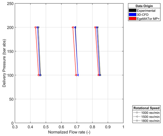 Figure A2 shows a comparison of the delivery flow rate between the experimental and the simulated data obtained from the lumped parameter numerical model developed with the EgeMATor MP+ tool. The higher number of working conditions reported in this appendix allows having a better overview of the capability of the model. The flow rate values have been normalized to a reference value, , for competitive reasons.