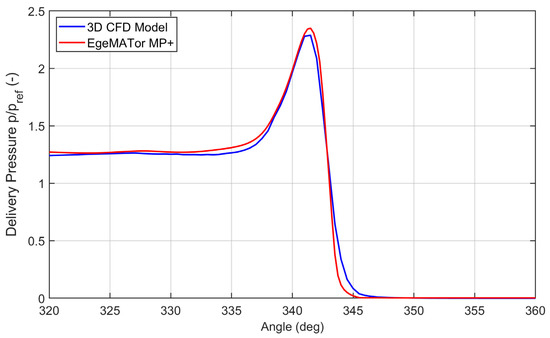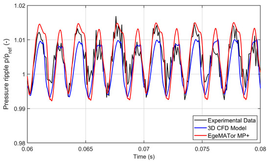 The analysis of the dynamic effects due to the pressure wave effects is virtually impossible to be executed with a lumped parameter approach numerical model due to the nature itself of the approach to impose the homogeneity of the physical properties inside the control volumes. Thus, to evaluate pressure ripples at the delivery side of the pump, a modification of the approach used has been implemented. The Simcenter Amesim® environment used to develop the hydraulic simulation subroutine has the capability to simulate straight hydraulic pipe by means of a one-dimensional (1D) CFD model, therefore allowing the study of the pressure variations inside the pipe. The hydraulic model has then been revised with the introduction of the hydraulic straight pipe model with the same fixed orifice used in the 3D CFD model and during the experimental tests that have been positioned on the delivery side of the pump. Finally, a pressure sensor transmitter has been added in the same position as the high-frequency pressure transducer P3 implemented in the experimental test campaign (as displayed in Figure 2).