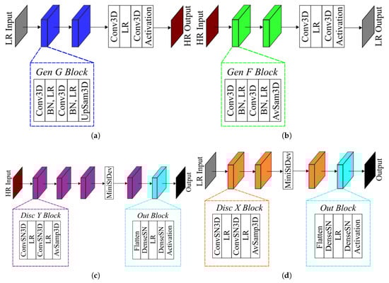 3D GAN architecture utilized for this study at resolution ratio . The generator G and F are shown in (a,b), and the discriminator and are shown in (c,d).