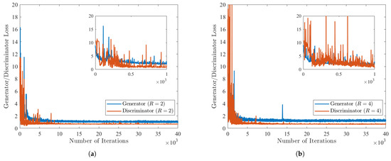 Losses from the generator and discriminator as a function of the number of training iterations for the proposed GAN model at (a) and (b) .