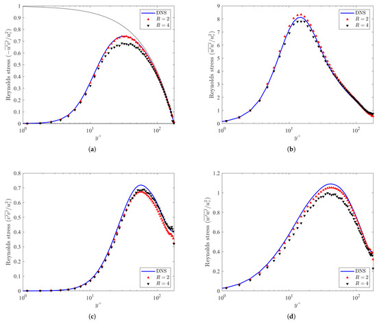 Likewise, the Reynolds normal stresses in the streamwise, wall-normal, and spanwise directions are displayed in Figure 6c,d. The peaks for each of the Reynolds normal stresses are , , and for the streamwise, wall-normal, and spanwise directions, respectively. Both the DNS and the predicted GAN normal stresses correspond to the same peak, indicating the consistence of the GAN with incompressible channel flow. Like the cases in Figure 5, the cases generally outperform the cases, with the exception of the wall-normal component of the Reynolds normal stresses, shown in Figure 6c.