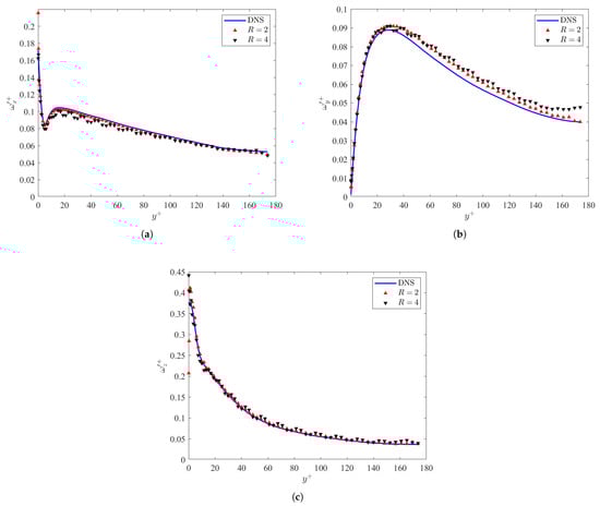 This section discusses the turbulent structures from the data generated by the ML algorithm compared to DNS. Figure 7a–c display the vorticity fluctuations in the channel for the DNS and predicted GAN datasets. The vorticity fluctuations predicted by the GAN in Figure 7a,c are in good agreement with the DNS throughout the channel. However, the wall-normal vorticity fluctuations are in good agreement until the peak at . This is due to the fact that near the wall, is dominated by the spanwise gradient of the streamwise velocity . This can be confirmed visually via Figure 5a–c. The deviations in at then demonstrate high sensitivity to the boundary conditions at the channel half-height .