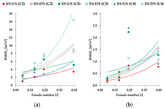 The values of the RMSE for the velocity component u show a strong dependence on the flow conditions: higher flow rate and lower flow depth (Figure 10 and Figure 11). On the other hand, the measured values of the velocity components v and w are also more sensitive to the higher flow rate than to the flow depth.