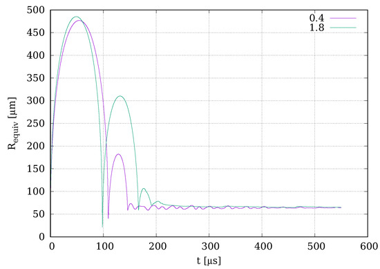 In order to have an idea of the bubble volume versus time (bubble oscillation) compared to the time of vortex generation and existence, the equivalent radius, , versus time is given for the normalized distance of the bubble to the boundary and 1.8 in Figure 2. The equivalent radius is defined as , where is the corresponding volume of the bubble.