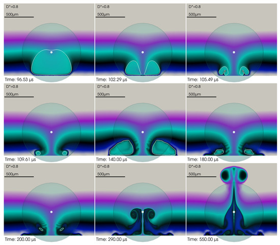 The temporal dynamics of the down-vortex generation are shown in the montage in Figure 8 for a bubble at . The main difference in the dynamics compared to the ones for the up-vortex in Figure 5 is the sequence of the bubble shape in the first rebound and second collapse. Here again, flow focusing isthe main driving force [5,55]. Flow focusing is the phenomenon generating the strongest acceleration where interface curvatures are highest. When comparing frame 5 ofFigure 5 to frame 6 of Figure 8, it is noted that the curvature of the torus bubble during the second bubble maximum volume and onset of the second collapse is highest at the outer rim for the up-vortex case, and the curvature is highest in the inner region for the down-vortex case. Therefore, the fluid motion is accelerated highest toward the axis of symmetry in case of the up-vortex, and it is accelerated outwards in case of the down-vortex during the second bubble collapse.