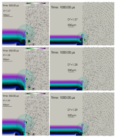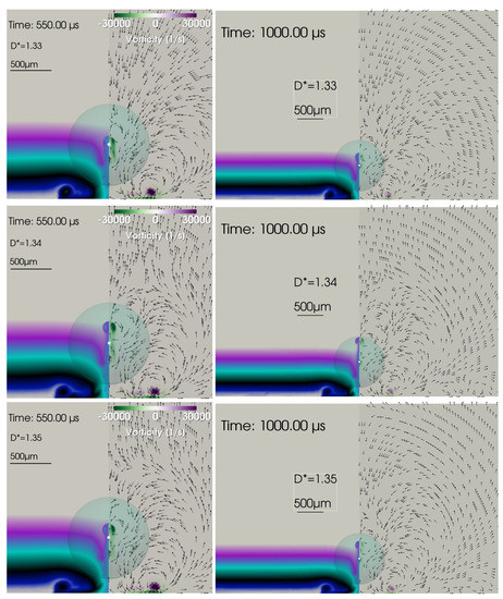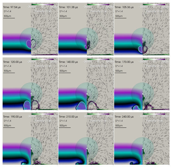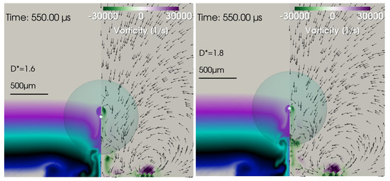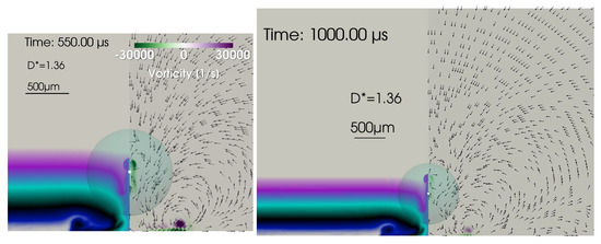 The vortices are dynamical objects that may move and/or change their form. Up-vortices move upwards away from the solid boundary, while down-vortices move toward the solid boundary. Reuter et al. [30] use the motion criterion for classification and call the upwards moving vortices “free vortices” and the downwards moving vortices “wall vortices”. The authors introduced a third status as well, tagged “no vortex”, when neither an up-vortex nor down-vortex was observed within experimental uncertainties. However, in the numerical simulations presented here, it becomes evident that the vortices are always present after the bubble oscillations have ceased. The difference is only in the intensity of the vorticity. In fact, both types of vortices are generally present. It is the ratio of their respective intensities that determines the macroscopic diagnosis made by an observer. An example is given in Figure 9 for . The clockwise rotation direction indicates an up-vortex, while the vortex does not seem to have moved upwards up to = 550 µs but is located away from the boundary. There, the flow rather rolls up, as seen in the left part of the plot. The extension to = 1 ms indicates a vortex with very slow motion upwards, confirming the classification of an up-vortex by its rotation direction from one frame only.
