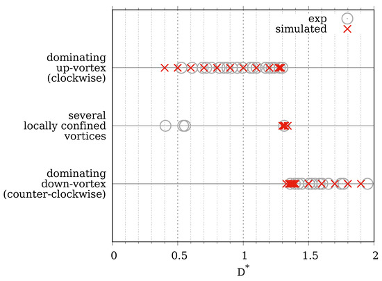 The two types of vortices can further be distinguished by the second type of visualization, as presented in Figure 4 by a toroidal rotation criterion. When in the cut only the right half part of the flow-direction map is considered, then the flow around an up-vortex is “clockwise”. Figure 6 shows an example of a vortex with clockwise rotation of the liquid, i.e., an up-vortex. Note that the rotation direction is only valid for the right part of the cut through the torus vortex. It is known that a ring vortex in an unbounded liquid propagates in the direction of the flow along its axis (see, e.g., Fraenkel [54]). When the vortex axis coincides with the axis of symmetry in an axially symmetric setting, then for a single vortex, the translational motion is upwards—using the terms introduced in the present work—when rotating clockwise, hence downwards when rotating counter-clockwise. However, when vortices come in larger numbers and are densely packed, the rotation criterion is best suited to characterize the type of vortex in an axially symmetric setting.