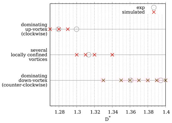 Comparison of numerically obtained vortex types (red crosses) to experiments by Reuter et al. [30] (gray circles). An excellent agreement is found. The approximation is assumed.