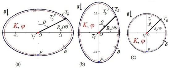 Schematics of the cross-sectional regions of the preformed steam chambers with the injection pipe (red dot) at the center and the recovery pipe (blue dot) lying at the bottom. All chambers have symmetric shapes with a generic equation of the edge, , given by Equation (1): (a) ellipse with horizontal semi-major axis; (b) ellipse with vertical semi-major axis; and (c) circumference. Through the thin layer of mean thickness , the water/oil emulsion drains by gravity to the production pipe. Scales on the axes are in meters.