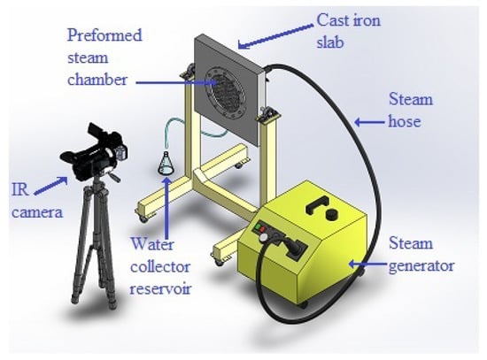 For the continuous steam injection into the preformed steam chambers, we used the same steam generator described in our previous experimental study [16]. In Figure 2, we schematically show the cast iron slab enclosing the circular steam chamber, which is mounted on a support structure and, at the rear of the chamber, the jet nozzle is connected to a radial diffuser located within the chamber. We used optic and IR cameras to visualize, in real time, the motion of fluid and the isotherms distribution whenever possible.