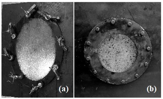The elliptical steam chamber of Figure 1b is materially the same as that of Figure 1a, which was manufactured in a cast iron slab with a height of m, a length of m, and thickness of m. To enclose the porous layer between two glass plates, the hollow elliptical space in the slab was filled with glass beads (soda lime) of diameter mm. With these data, we reported in [16] that the mean porosity is and the permeability is m. These same values are assumed to be valid for the porous medium in the circular steam chamber since the same glass beads were used in this case.