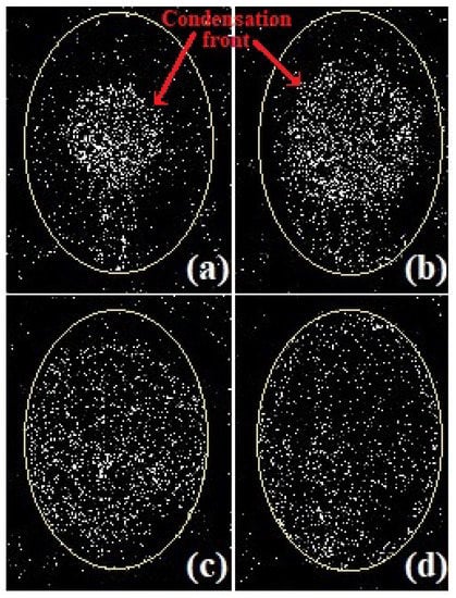 A digital image subtraction treatment was applied to photographs taken every 12 s during experiments, where the optimal steam injection was reached. In Figure 4, we present different stages of the evolution of the front within the elliptical steam chamber with a vertical semi-major axis. In addition, we show the evolution of the condensation front from the central diffuser up to the chamber edge. In Figure 4a, the advancement of the condensation front was nearly radial, and in Figure 4c,d, we observed that the condensation front first reached the regions close to and , and finally, the front reached the top () and lower () regions.