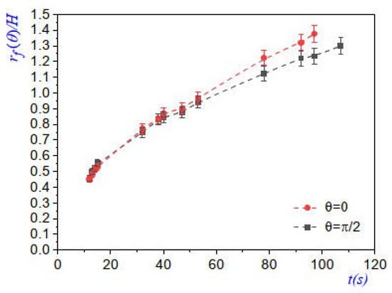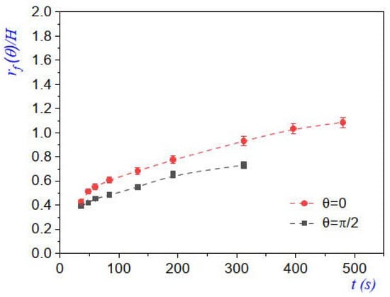 We now present experimental results similar to those in the previous subsection but for circular cross sections; all data were obtained for the corresponding optimal injected mass flow of steam, . In Figure 8, we show the evolution plot of the condensation front as it approached the chamber edge. In Figure 9, we present the plot of the evolution along the vertical line (dashed red curve) and along the horizontal line (dashed black curve). Now, the exponents of the power law are if and if . These exponents indicate, as can be seen in Figure 8, that the initial fronts were nearly circular and behaved approximately according to the power law for hot water radial injection [28].