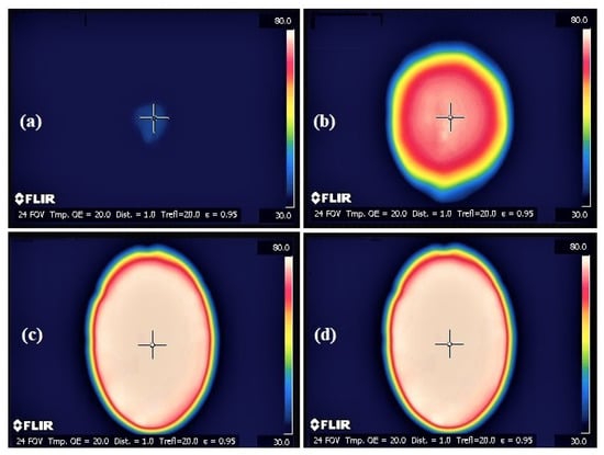 In addition, the time-dependent temperature distributions in the preformed steam chamber during the steam injection (see Figure 6) were obtained using an infrared camera: model FLIR SC660, which had a high performance infrared system within the long-wave spectral range: 7.5–13 m. It should be mentioned that the temperature scales in the thermographies Figure 6a–d needed to be corrected with surface radiation exchange methods [29]. This was performed knowing the thickness and the physical properties (density and refractive index values) of the observation window, which was made from soda lime glass and allowed the visualization of the steam flow and temperature distributions.