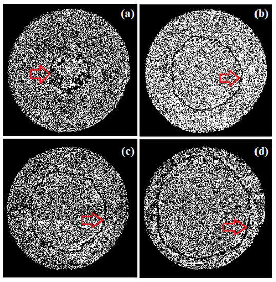 Pictures obtained through image subtraction of the evolution of the condensation front (indicated by the arrows) during steam injection into the preformed circular steam chamber. Images correspond to (a) s, (b) s, (c) s, and (d) s after injection start-up.