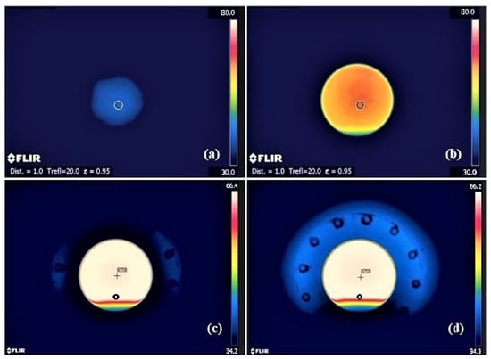 Following the study of the thermalization of the preformed circular steam chamber, we provide four thermographies for the indicated time instants in Figure 10. Through Figure 10c,d, we notice that, at the bottom, a water accumulation (liquid pool) appeared as a consequence of the recovery orifice (black dots in said figures), located 0.03 m above the lower edge of the chamber. It is apparent that similar cases could occur in actual SAGD processes, similar to the lean zone discussed in the Introduction. Therefore, the experimental visualization of this case is of interest [30].