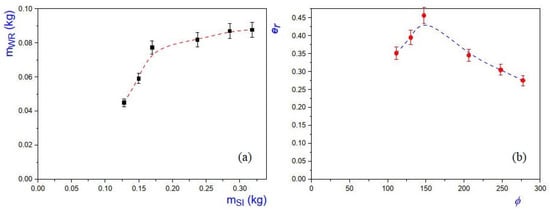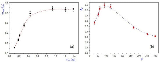 In Figure 12a, we show the plot of the mass of water recovered as a function of the mass of the injected steam , and in Figure 12b, the plot of the recovery efficiency as function of the dimensionless injected mass flow rate per unit length is given. Clearly, from the plot in Figure 12b, it can be concluded that the dimensionless injected optimal mass flow rate per unit length was and, at this value, the recovery efficiency was close to 90%, i.e., .