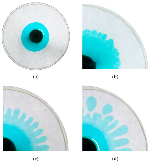 The initial shape of the interface is a circle in radial and conical Hele-Shaw cells. The interface performs radial oscillations relative to its initial position in the subcritical region. According to the observations, the interface maintains a concentric shape in the phases of the maximum displacement (Figure 2a and Figure 3a). An increase in the oscillation amplitude leads to the quasi-stationary irregular ripple formation, which oscillates with a period equal to the period of the liquid oscillation (Figure 2b and Figure 3c). The behavior of the interface in the course of oscillations in a conical and flat radial cell is similar. When reaching the critical amplitude, the instability develops in the form of azimuthally distributed low-viscosity fingers: the low-viscosity fluid penetrates the high-viscosity one when the interface moves towards the latter (Figure 2c and Figure 3d). When the interface moves towards the low-viscosity fluid, the fingers almost disappear. The instability is local: the viscous fingering develops at the part of the interface due to the asymmetry of the initial position of the interface. With a further increase in the oscillation amplitude, fingers cover the entire interface.