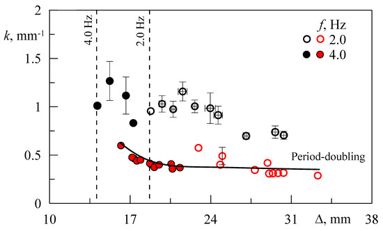 Here we consider the dynamics of the finger patterns in the supercritical domain. The wavenumber almost does not change with an increase in the oscillation amplitude along a fixed radial direction. Herewith, disturbances with different wavelengths simultaneously exist at the interface. This explains the significant difference in measuring the wavenumber for given values of (Figure 4). When increasing , the second mode with half wavenumber mm−1 appears along with the fundamental mode (red symbols in Figure 4). Photographs of the interface in the supercritical domain are shown in Figure 3. One can find that all fingers are coupled. This indicates a spatial period-doubling of the pattern, which is typical for the system under consideration. A similar effect was observed in a rectangular Hele-Shaw cell under oscillations of the fluid–fluid interface (Kozlov and Vlasova [23]). On the contrary, the period-doubling for the traditional arrangement of fluids was not observed in a radial Hele-Shaw cell (Karpunin and Kozlov [22]).