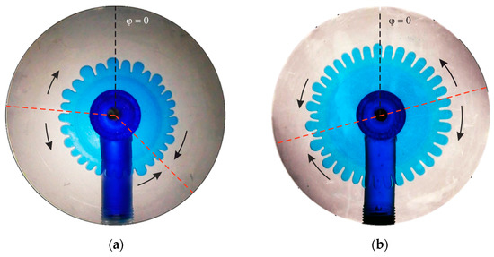 The photographs of the interface at the start of the measurements of the azimuthal drift at (a) and Hz; (b) and Hz. The black dashed line corresponds to the azimuth reference direction. The red dashed lines indicate azimuthal directions where drift is absent. Black arrows show the drift direction.