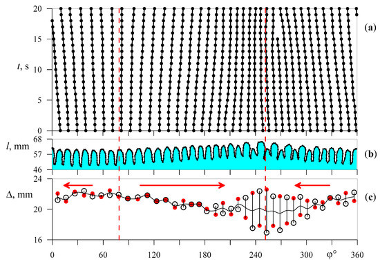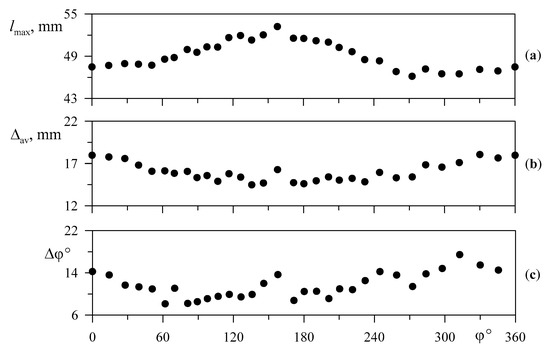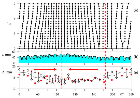For the analysis of the azimuthal drift, we determine the interface shape in the phase of the maximum displacement (Figure 9). Here, the circles indicate the height of the fingertips shown in Figure 7b. The interface is non-axisymmetric: the coordinate of the minimum height corresponds to the maximum of peak-to-peak displacement (Figure 7c) and to the region of the emergence of viscous fingers, while the coordinate of the minimum of peak-to-peak displacement shows the region of the merger. A comparison of the peak-to-peak displacement (Figure 7c) with the interface displacement (Figure 9a) shows that the position of the interface in the conical cell determines the oscillation amplitude. The farther the interface is from the cell axis, the smaller the amplitude of the interface oscillations. Obviously, this follows from a linear increase in the circumference with an increase in the radial size of the interface. In turn, an increase in the amplitude of the interface oscillations causes an increase in the angular size of the fingers (Figure 9b,c). As will be shown below, this is typical for oscillatory finger instability. Therefore, the peak-to-peak displacement of the interface is the governing parameter of the problem which determines (a) the threshold for the instability, (b) the wavelength of the fingering instability, and (c) the azimuthal drift of fingers.