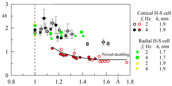 One can find that dimensionless wavenumbers for conical (red and black symbols) and radial (green and yellow symbols) cells agree well with each other. It can be concluded that the origin of the finger-type instability in the conical and radial Hele-Shaw cells is of the same type, and the threshold is determined by the relative amplitude of the interface oscillations. A specific feature of the fingering instability in the conical cell is the period-doubling mode, which manifests itself in the overcritical region. Recently, period-doubling was also revealed in experiments with a rectangular Hele-Shaw cell in Reference [23]. The absence of this phenomenon in the radial cell indicates that the doubling of the period in the conical cell is associated with constrained conditions for finger growth; in the radial cell, neighboring fingers grow without intensive interference with each other.