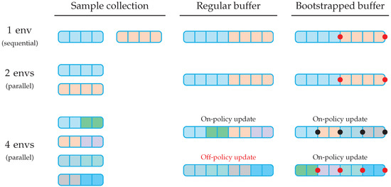 Although efficient, the approach introduced above comprises two major drawbacks. First, the “over-parallelization process” inherently leads to off-policy updates of the agent (i.e., the agent is trained with samples produced by a previous policy), which introduces bias in the policy gradient estimates and increases the risk of the agent falling into local optima. While importance sampling corrections could be used to account for the discrepancy between the current policy and the behavior policy, such an approach is known to introduce large variance in the estimate and require additional tuning [19,20]. Second, in order to take maximum advantage of the parallel sample collection, this approach constrains the size of the buffer update to be (i) a multiple of the number of transitions within an episode, and (ii) a multiple of the number of parallel environments. These two points may lead either to a suboptimal control model or to a suboptimal use of the available computational resources. To overcome these issues, we propose an update approach based on partial trajectories terminated by a return bootstrapping step to mimic a continuing environment (i.e., the last reward of each parallel update buffer is modified to account for the continuous nature of the control task). The concept of partial trajectories is not new and was, for example, presented by Schulman in the original proximal policy optimization (PPO) paper (see [21], Section 5), while the bootstrapping method was originally proposed by Pardo et al. [22]. As will be shown below, the combination of these two approaches allows us to design a flexible parallel sample collection pattern, while retaining the on-policiness of the PPO algorithm (i.e., the agent is trained with samples produced by the current policy). This represents a major asset in the context of fluid flow control, where efficient parallel sample collection eventually allows the control of complex, CPU-intensive environments.