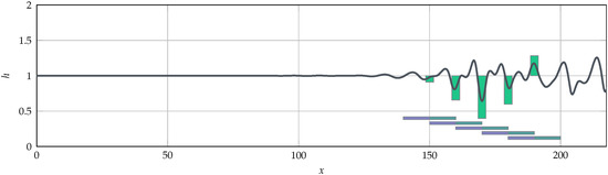with being the noise level. As shown in Figure 3, the introduction of a random uniform noise at the inlet triggers the development of exponentially growing instabilities (blue region) which eventually transition to a pseudo-periodic behavior (orange region). Then, the periodicity of the waves break, and the instabilities turn into into pulse-like structures, presenting a steep front preceded by small ripples [31]. It is observed that some of these steep pulses, called solitary pulses, travel faster than others, and can capture upstream pulses in coalescence events. The dynamics of these solitary pulses are fully determined by the parameter, while the location of the transition regions also depends on the inlet noise level [30].