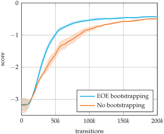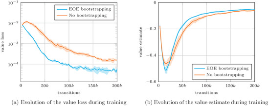 To better understand the effects of the EOE bootstrapping, the plots of the value loss and value estimate along the course of training are proposed in Figure 6a,b, respectively. A significantly lower value loss is observed, indicating that the EOE bootstrapping, by solving the credit assignment issue [22], induces a smoother value landscape for the critic to learn. This results in higher value estimates, which is expected due to the nature of the EOE bootstrapping procedure.