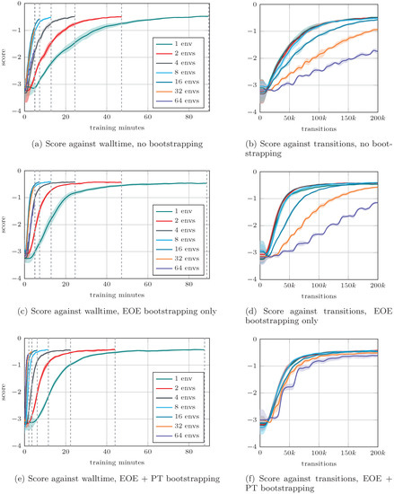 - For , a rapid decrease in convergence speed and final score is observed for the regular approach, with , resulting in very poor performance (Figure 7b). This illustrates the reasons that motivated the present contribution, i.e., that the standard parallel paradigm results in impractical constraints, which prevents massive environment parallelism. Introducing EOE bootstrapping (Figure 7d) improves the situation by (i) generally speeding up the convergence, and (ii) improving the final performance of the agents, although the final score obtained for remains sub-optimal, while that of is poor. Additionally, the “flat steps” phenomenon described in [18] clearly appears for and 64, with the length of the steps being roughly equal to the number of transitions unrolled between two updates of the agent. When adding PT bootstrapping (Figure 7f), a clear improvement in the convergence speed is observed even for large values, and the gap in final performance significantly reduces. The flat steps phenomenon is still observed in the early stages of learning for and 64, although with significantly reduced intensity.