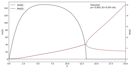 For glycerin at , the first 10 branches of imaginary parts of frequencies are illustrated. When K increases, the two lowest branches meet and give rise to a nonzero real part, but the majority of frequencies remain totally imaginary.