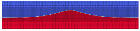 In the linear regime, we set the wave amplitude to of the depth. As illustrated in Figure 5, this configuration confirmed the linear behaviour as discussed in [33]. On the other hand, for the nonlinear regime, the wave amplitude was set to half the depth. This resulted in the formation of a double hump, a characteristic feature corresponding to the second-order approximation. The observation of this feature provided an affirmation of the nonlinear dynamics inherent in our theoretical approach and simulation model. Hence, through the use of OpenFOAM and the specific simulation parameters, our study supports the second-order perturbative-approach theory, providing a comprehensive understanding of the capillary–gravity surface wave propagation.
