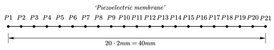 Since the time evolution of the pressure acting on the center of the diaphragm exhibits periodicity, its amplitude, i.e., its maximum fluctuation width, was considered to be the basic criterion to comparatively assess the energy harvesting potential of the flow from such a device [8]. To monitor the pressure on the diaphragm, 21 distinct equidistant positions were defined along it on the upper channel wall, denoted by the points P1, P2, …, P21 (Figure 3). These points serve to evaluate and compare local pressure signals, as well as estimate corresponding amplitude values. The latter is for searching for the maximum energy harvesting potential of the device in the sense that the best performance will be exhibited if the center of the membrane is located at the position experiencing the maximum amplitude of pressure pi(t), i = 1, 2, …, 21.